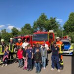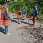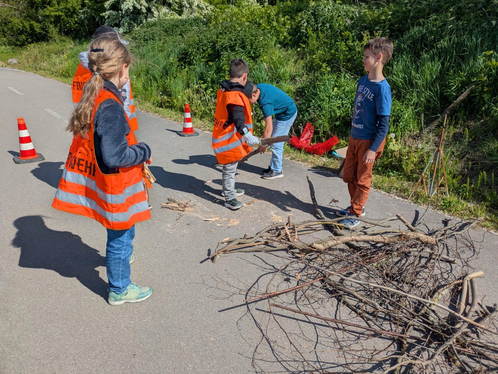 In 3 Teams ging es dann zu den 3 Stationen auf dem Verkehrsübungsplatz. Hier kamen die Maingründler Feuerwehrler zum Einsatz. Die Kinder lernten den Ablauf eines Feuerwehreinsatzes und wurden selbst tätig. Was ist zu tun bei einem brennenden Haus, bei einem Unfall mit Öl auf der Straße und wie wird eine von einem Baum blockierte Straße gesichert. Im Team erledigten die Kinder die geforderten Aufgaben wie Schläuche verbinden und Feuer löschen oder das Öl binden und beseitigen sowie die Sicherung und Absperrung des Einsatzortes. Mit Kelle, Warndreieck und Warnwesten ausgestattet fühlten sie sich wie die Großen. Bei der Baumaktionen erhielten sie noch einen Einblick in die Schutzkleidung für Arbeiten mit der Motorsäge. Die Gruppenstunde ging viel zu schnell vorbei und hat allen Beteiligten riesigen Spaß gemacht.